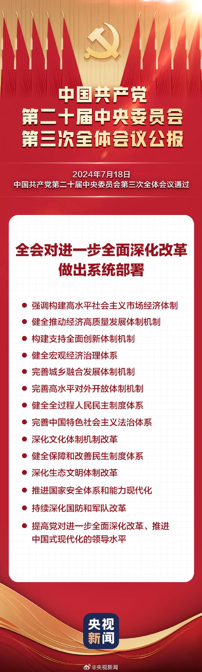 中國共產(chǎn)黨第二十屆中央委員會第三次全體會議于2024年7月15日至18日在北京舉行,全會對進(jìn)一步全面深化改革做出系統(tǒng)部署,強(qiáng)調(diào)構(gòu)建高水平社會主義市場經(jīng)濟(jì)體制,健全推動經(jīng)濟(jì)高質(zhì)量發(fā)展體制機(jī)制,構(gòu)建支持全面創(chuàng)新體制機(jī)制,健全宏觀經(jīng)濟(jì)治理體系,完善城鄉(xiāng)融合發(fā)展體制機(jī)制,完善高水平對外開放體制機(jī)制,健全全過程人民民主制度體系,完善中國特色社會主義法治體系,深化文化體制機(jī)制改革,健全保障和改善民生制度體系,深化生態(tài)文明體制改革,推進(jìn)國家安全體系和能力現(xiàn)代化,持續(xù)深化國防和軍隊改革,提高黨對進(jìn)一步全面深化改革、推進(jìn)中國式現(xiàn)代化的領(lǐng)導(dǎo)水平。