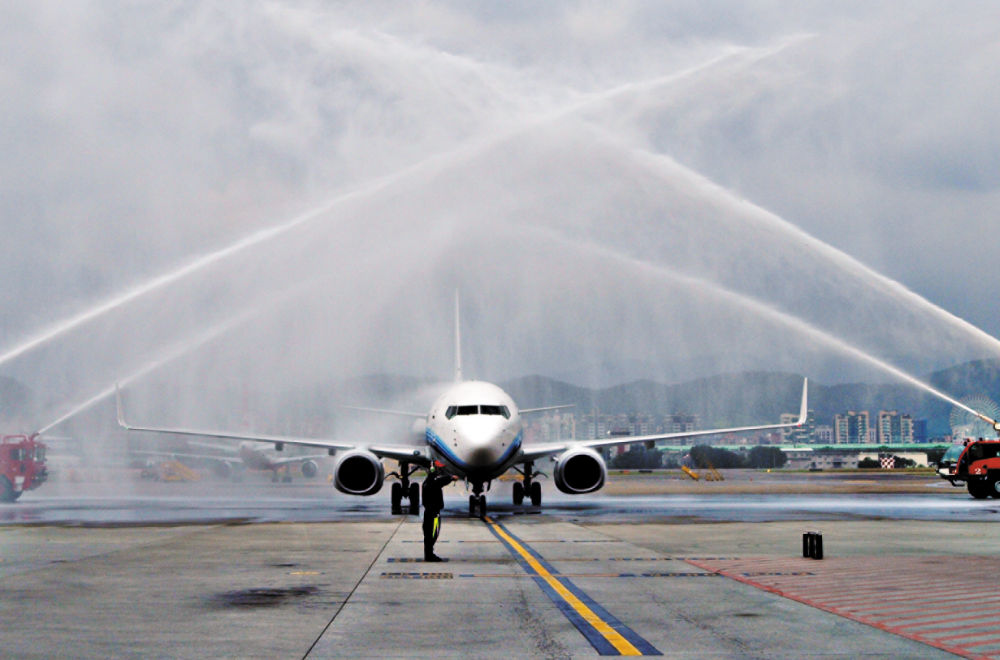 2008年,兩岸“三通”啟動常態(tài)包機(jī),廈航成為廈門、福州和杭州航點(diǎn)的運(yùn)營航空公司。這是2008年12月15日,臺北松山機(jī)場以“水門”儀式迎接廈航常態(tài)化包機(jī)。
