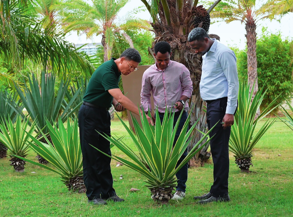 在三亞崖州灣科技城,非洲留學(xué)生跟隨中國熱帶農(nóng)業(yè)科學(xué)院研究員易克賢(左一)在觀察劍麻育種材料長勢(shì)(2024年5月17日攝)。黎多江攝/本刊
