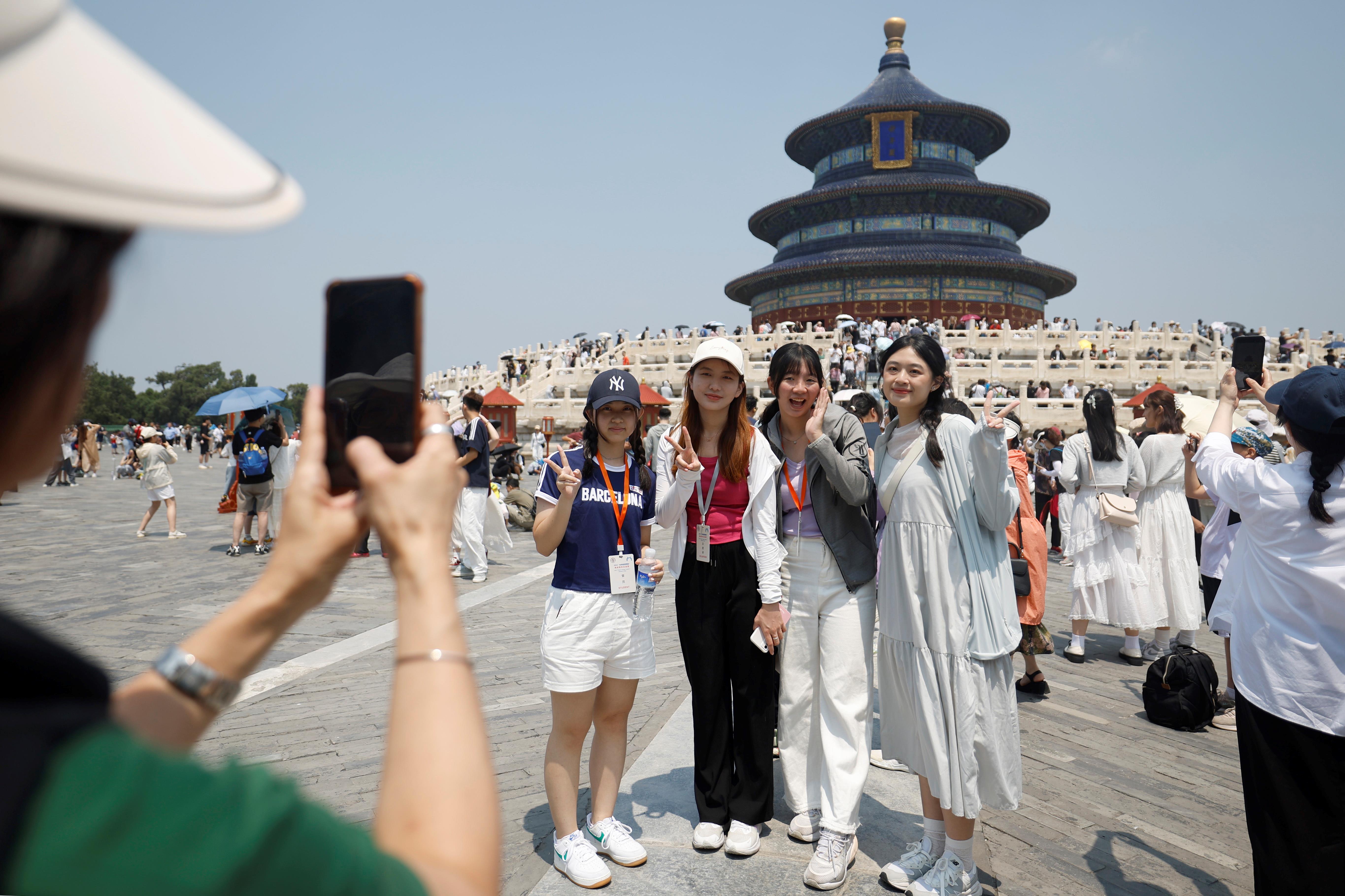 2024年7月3日,臺灣青年在天壇公園拍照留念。當日,2024“未來能源領(lǐng)袖”兩岸青年交流營的營員參觀游覽北京的奧林匹克公園、天壇公園等地。
