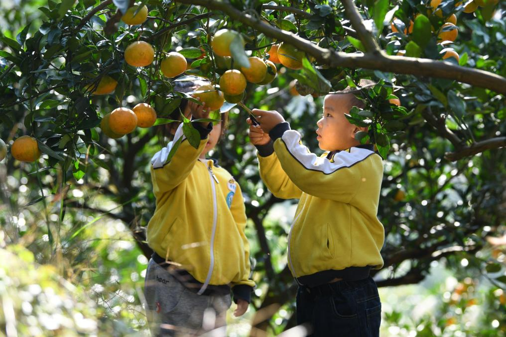 貴州黃平縣小朋友在校外勞動(dòng)實(shí)踐基地采摘柑橘。