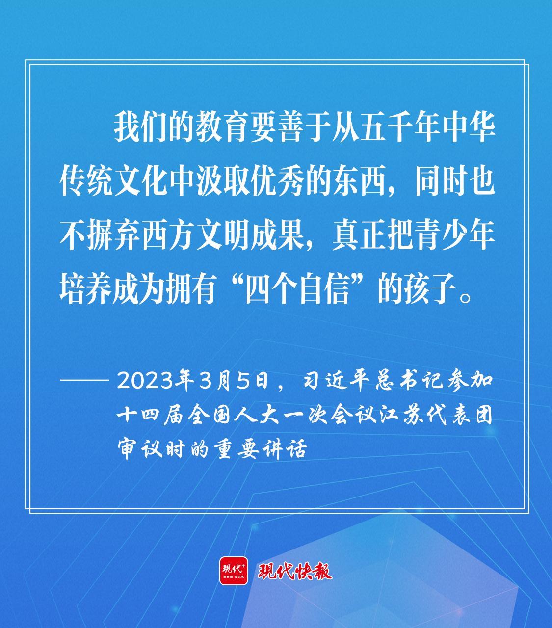2023年3月5日,習(xí)近平總書記參加十四屆全國人大一次會(huì)議江蘇代表團(tuán)審議時(shí),勉勵(lì)教育工作者“要善于從五千年中華傳統(tǒng)文化中汲取優(yōu)秀的東西,同時(shí)也不摒棄西方文明成果,真正把青少年培養(yǎng)成為擁有‘四個(gè)自信’的孩子?!?/p>