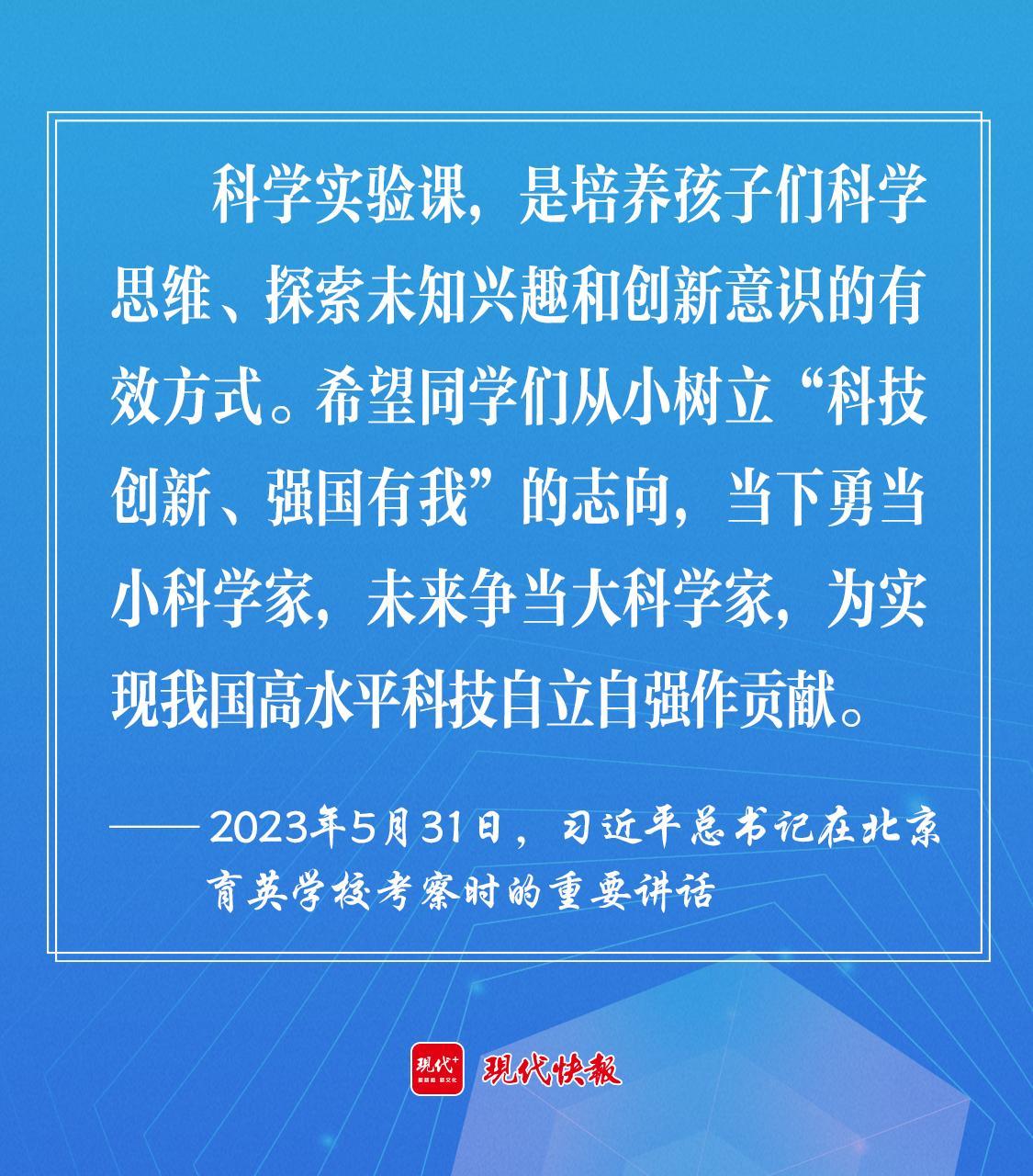 2023年5月,習(xí)近平總書記在北京育英學(xué)??疾鞎r(shí)強(qiáng)調(diào),希望同學(xué)們從小樹立“科技創(chuàng)新、強(qiáng)國有我”的志向,當(dāng)下勇當(dāng)小科學(xué)家,未來爭(zhēng)當(dāng)大科學(xué)家,為實(shí)現(xiàn)我國高水平科技自立自強(qiáng)作貢獻(xiàn)。