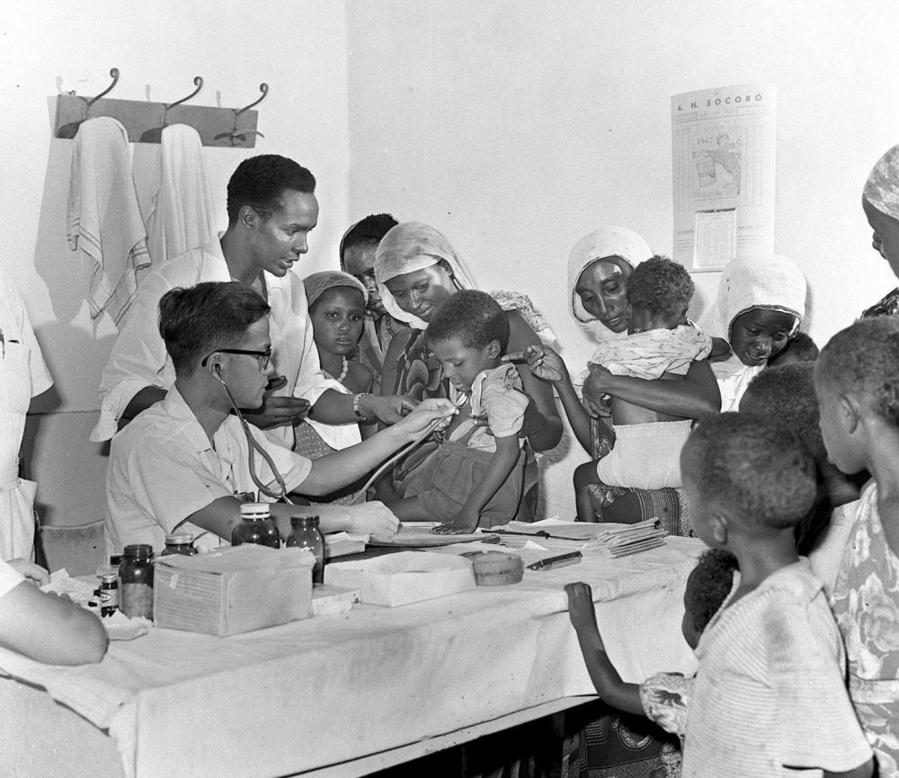 1968年4月,中國醫(yī)療隊醫(yī)生在索馬里阿弗戈依鎮(zhèn)巡回醫(yī)療時為當?shù)貎和尾 ?/p>