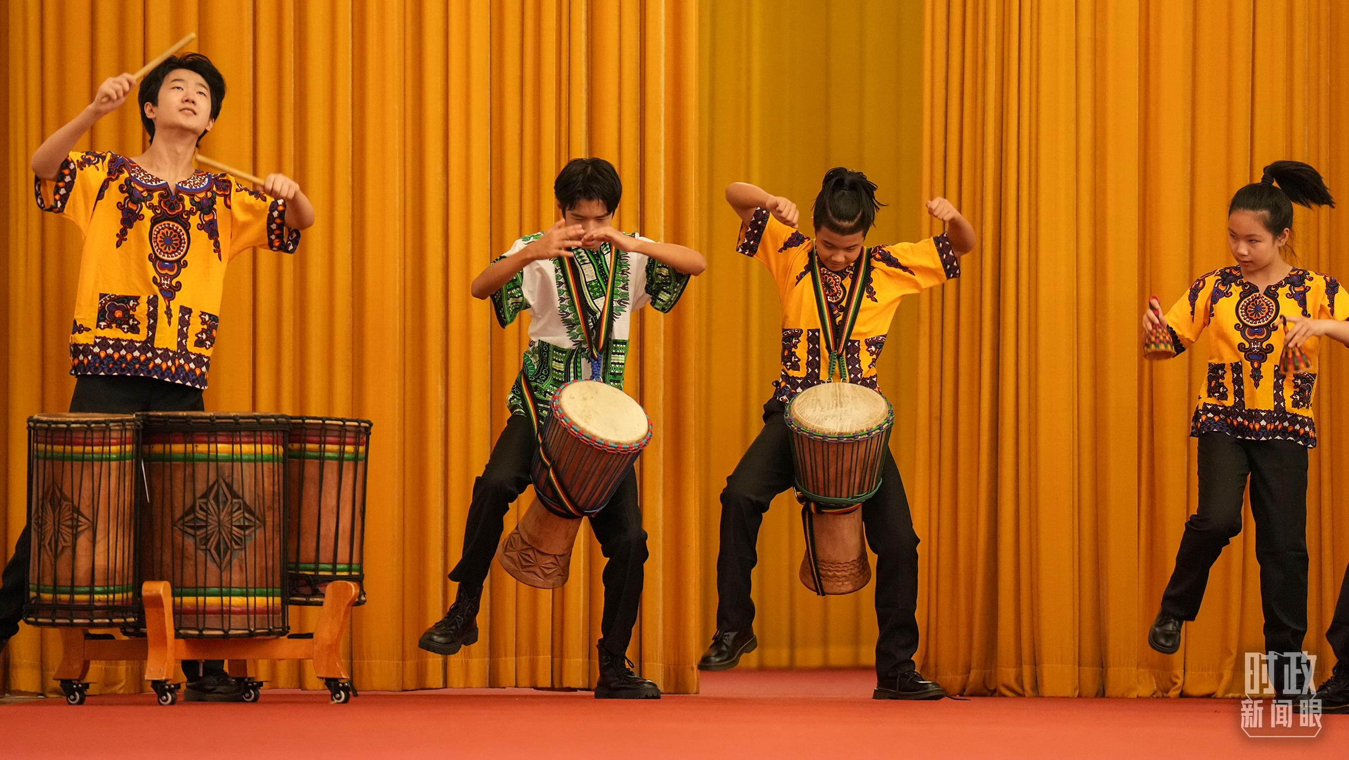 中國少年打起歡快的非洲鼓。(總臺(tái)記者李晉拍攝)
