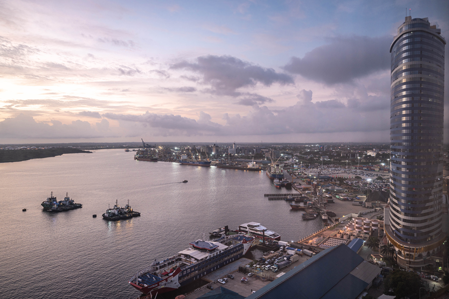 這是2023年12月29日拍攝的日出時分的坦桑尼亞達(dá)累斯薩拉姆港。新華社記者 王冠森 攝
