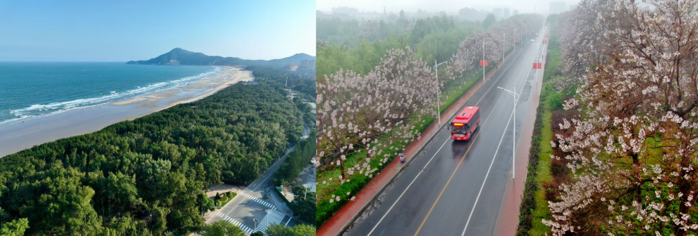 拼版照片:左圖為位于東山縣金鑾灣沿岸的木麻黃防護(hù)林帶(無(wú)人機(jī)照片,新華社記者 姜克紅 攝);右圖為2021年4月20日在蘭考縣焦裕祿干部學(xué)院附近拍攝的泡桐花(無(wú)人機(jī)照片,新華社記者 郝源 攝)。