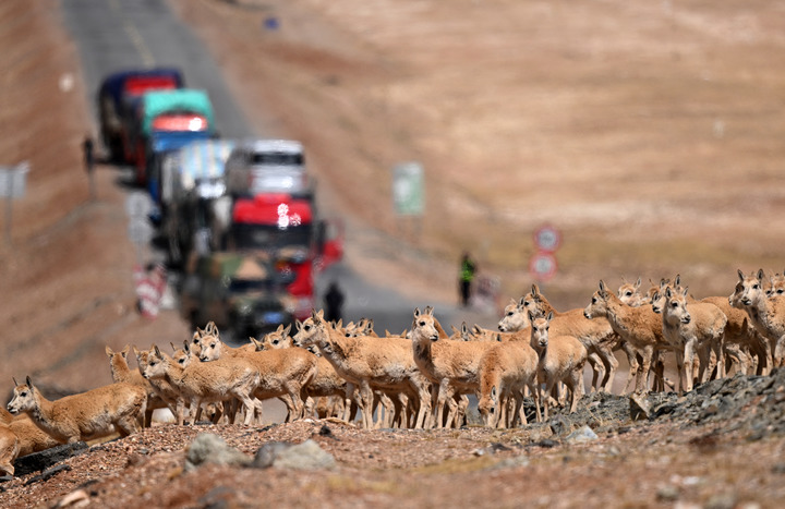 2023年5月29日,當(dāng)?shù)毓芾聿块T(mén)工作人員在青藏公路上臨時(shí)截停來(lái)往車(chē)輛,為一群前往可可西里卓乃湖產(chǎn)仔的藏羚羊讓路。可可西里地處三江源國(guó)家公園,是國(guó)家一級(jí)保護(hù)動(dòng)物藏羚羊重要的棲息地。每年5月至7月,來(lái)自青海三江源、新疆阿爾金山、西藏羌塘的雌性藏羚羊會(huì)遷徙到可可西里卓乃湖,待產(chǎn)仔后再攜幼仔返回原棲息地。