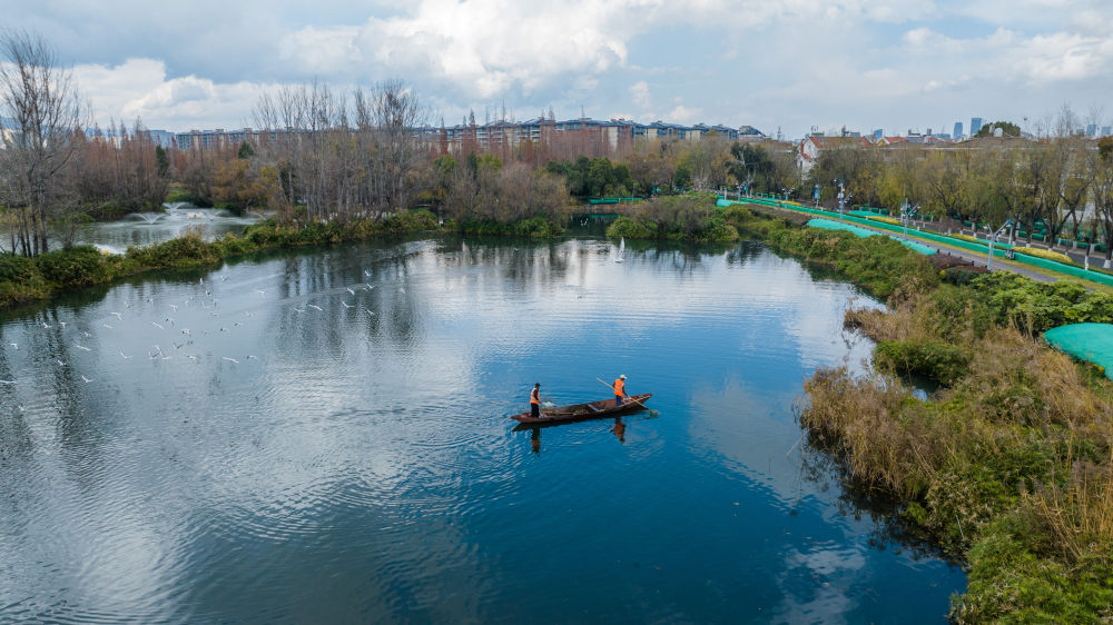 2024年1月16日,管護(hù)人員在滇池打撈雜物(無(wú)人機(jī)照片)。據(jù)昆明市滇池管理局介紹,2023年滇池全湖水質(zhì)持續(xù)向好,自2018年上升為Ⅳ類(lèi)水質(zhì)后,連續(xù)六年保持全湖水質(zhì)Ⅳ類(lèi)。