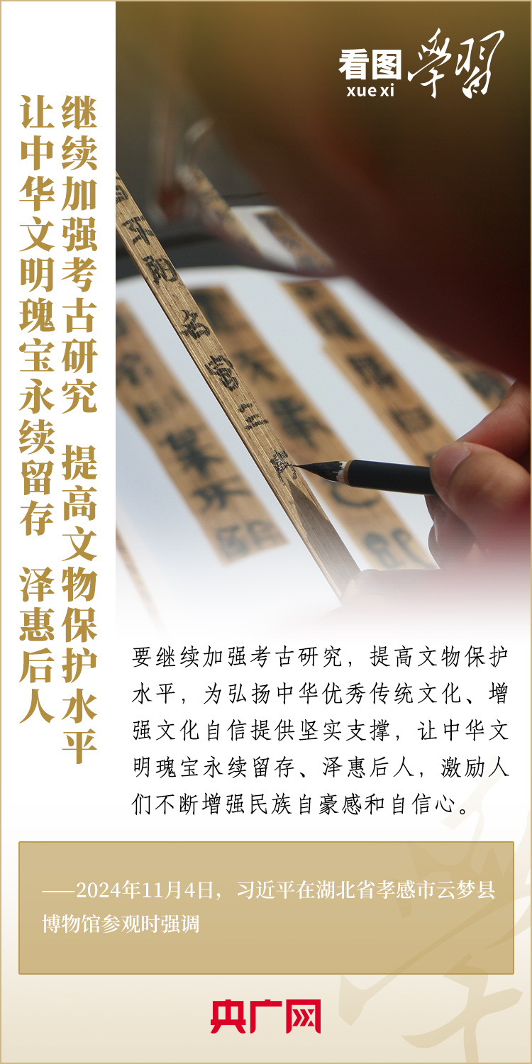 11月4日,習(xí)近平總書記在湖北省孝感市云夢(mèng)縣博物館參觀出土秦漢簡(jiǎn)牘展。這里收藏的我國(guó)考古史上首次發(fā)現(xiàn)的秦簡(jiǎn)——云夢(mèng)睡虎地秦簡(jiǎn),反映了戰(zhàn)國(guó)晚期到秦始皇時(shí)期的政治、經(jīng)濟(jì)、文化、法律、軍事等方面的情況。習(xí)總書記詳細(xì)聽取簡(jiǎn)牘內(nèi)容、歷史文化價(jià)值和保護(hù)研究情況介紹,指出要繼續(xù)加強(qiáng)考古研究,提高文物保護(hù)水平,讓中華文明瑰寶永續(xù)留存、澤惠后人。