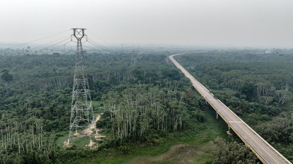 這張9月13日拍攝的照片顯示,在巴西朗多尼亞州,EDP輸變電項目線路穿越熱帶雨林(無人機照片)。巴西EDP輸變電項目是位于巴西北部的阿克里州和朗多尼亞州的綠地輸變電工程,山東電建一公司承擔(dān)了該項目的EPC總承包任務(wù)。新華社記者王天聰攝