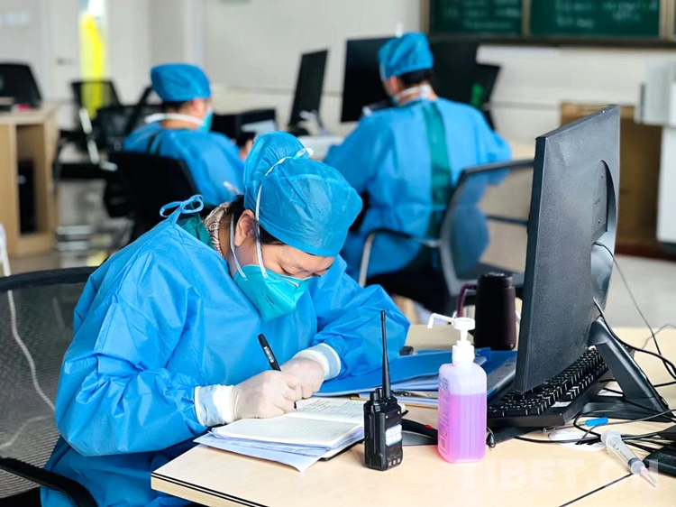 圖為拉薩市第二座方艙醫(yī)院護(hù)理隊隊長央宗在記錄一天的重點(diǎn)工作 攝影:次仁卓瑪