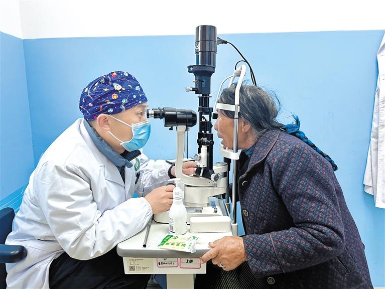 圖為醫(yī)護人員為前來問診的農(nóng)牧民群眾進行眼部檢查。記者 丹增平措 攝