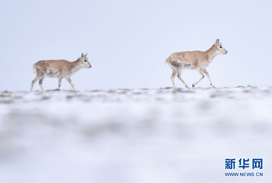 4月20日,兩只藏羚羊向卓乃湖方向行進。新華社記者 吳剛 攝
