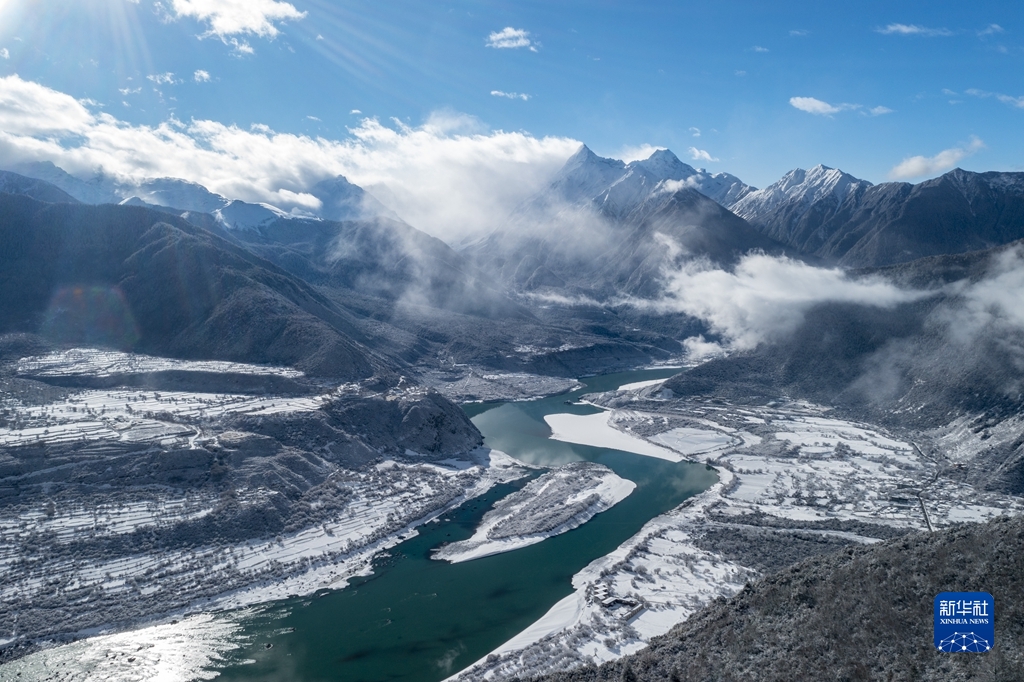 當(dāng)日,西藏林芝市米林縣派鎮(zhèn)雅魯藏布大峽谷附近普降瑞雪,銀裝素裹的雅魯藏布江和南迦巴瓦峰顯得格外壯美。