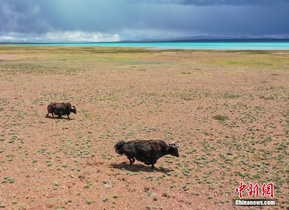 7月16日,西藏那曲羌塘草原上的野牦牛。羌塘草原位于西藏北部,是野生動物的樂園。(無人機照片) 中新社記者 貢嘎來松 攝