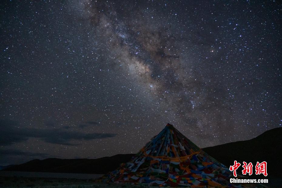 西藏羊卓雍錯湖畔的經幡與銀河。江飛波 攝