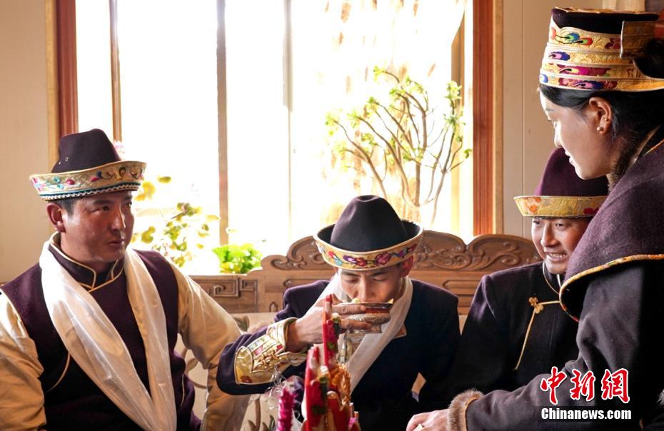 11月24日恰逢藏歷十月初一,西藏林芝迎來(lái)2023年工布新年,這是西藏最早的新年。工布新年以其悠久的歷史、鮮明的特色、豐富的內(nèi)涵,于2006年被列入第一批西藏自治區(qū)非物質(zhì)文化遺產(chǎn)保護(hù)名錄。圖為村民向客人敬酒。 阿仁 攝