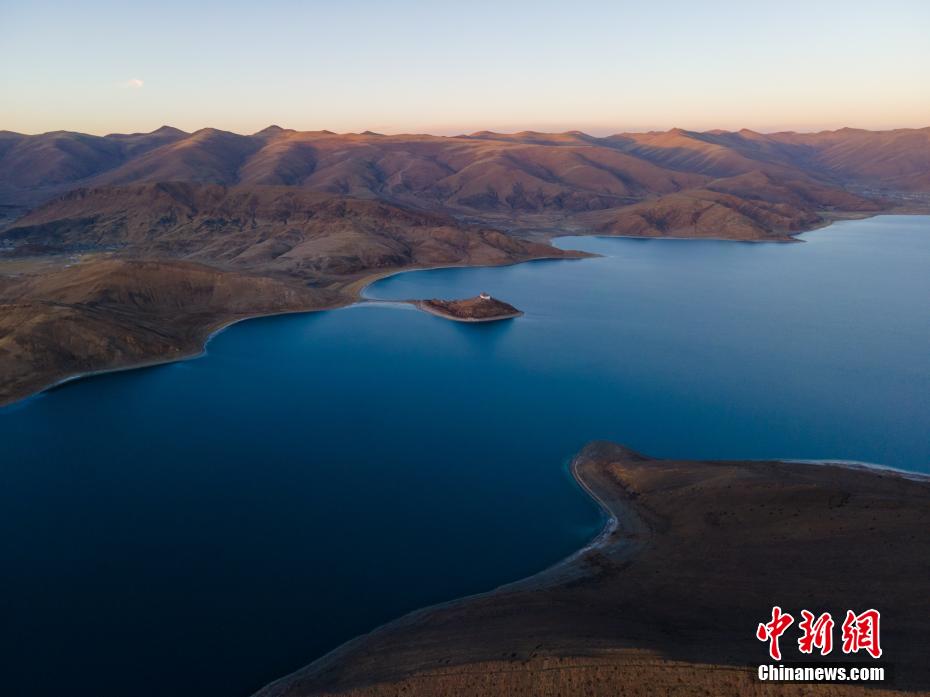 近日,西藏自治區(qū)山南市羊卓雍錯(簡稱羊湖),冬日由于沒有云層遮擋,湖水更顯深藍、孔雀藍。航拍視角下,湖水像巨大的寶石鑲嵌于高原大地,風(fēng)光壯麗。羊卓雍錯藏語意為“碧玉湖”,湖面海拔4441米,與納木錯、瑪旁雍錯并稱西藏三大“圣湖”。圖為羊湖著名景點日托寺。 江飛波 攝
