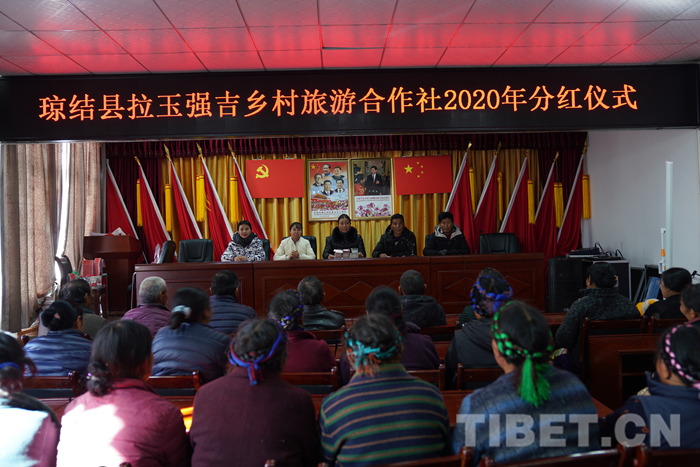 這是拉玉強吉鄉(xiāng)村旅游專業(yè)合作社首次分紅儀式的現(xiàn)場,44戶村民代表臉上掛滿了笑容,準備分享勤勞付出結(jié)出的香甜碩果。