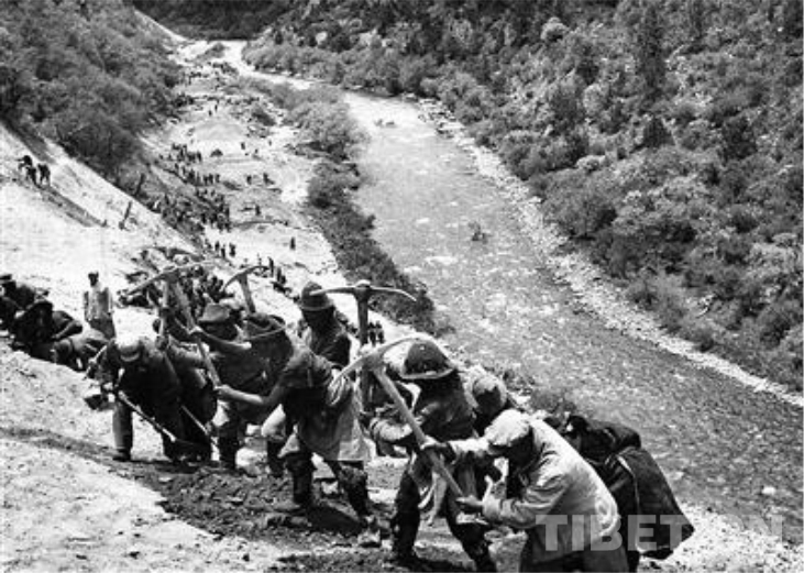 圖為筑路部隊在波密一帶修筑康(川)藏公路