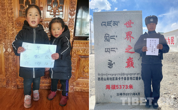 這是一張拼版照片,姐姐洛桑卓瑪,今年5歲,妹妹益西卓嘎,今年3歲。她們的父母——洛桑曲扎和索郎卓瑪,一個(gè)是浪卡子縣普瑪江塘鄉(xiāng)的移民管理警察,一個(gè)是山南市的特警,夫妻倆已經(jīng)三年沒有在家陪兩個(gè)女兒過年了。春節(jié)將至,洛桑曲扎堅(jiān)守在全國海拔最高的普瑪江塘邊境派出所,守護(hù)邊境,保衛(wèi)祖國。