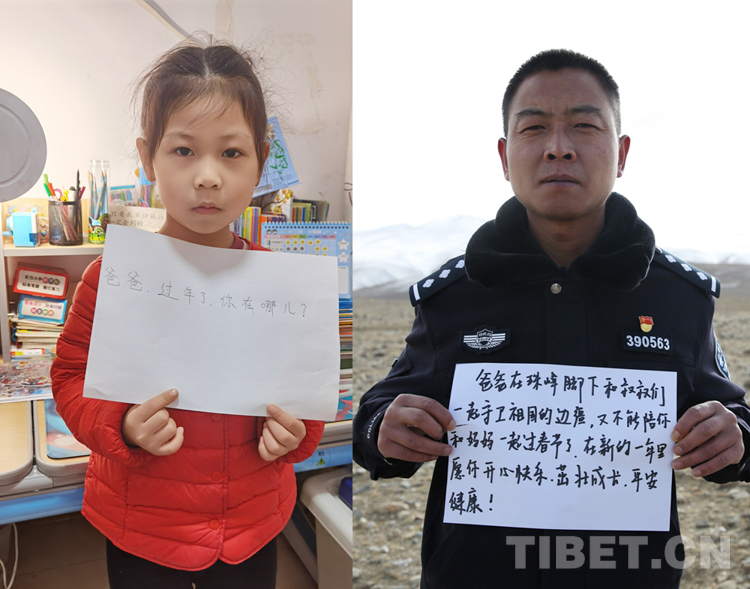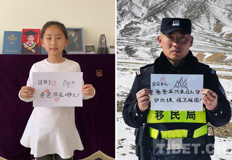 這是一張拼版照片,小女孩名叫旦增諾央,今年8歲,到現(xiàn)在還沒有和爸爸一起過過年。爸爸旦增尼瑪是日喀則邊境管理支隊(duì)亞熱邊境派出所所長,春節(jié)將至,他和戰(zhàn)友們堅(jiān)守在海拔5300多米的中尼邊境一線,他通過這種方式表達(dá)對(duì)孩子的思念,相信慢慢長大的孩子一定能夠理解自己。