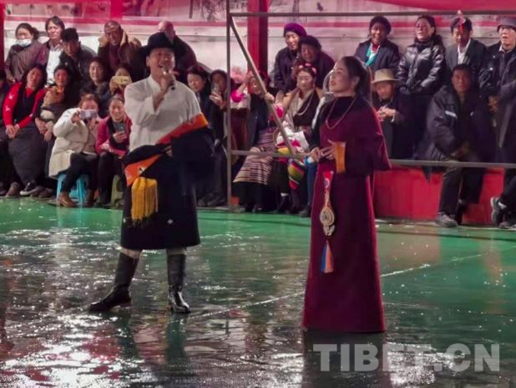 演出活動(dòng)在服飾表演《幸福的日子》中拉開序幕。安麥西組的農(nóng)牧民群眾身著節(jié)慶盛裝走上舞臺(tái),精彩的服飾走秀展示了當(dāng)?shù)孛褡逄厣?;歌曲《弦舞芒康》《心中紅》引得群眾情不自禁地和唱,動(dòng)人的歌詞句句唱進(jìn)了觀眾的心坎里;群眾自導(dǎo)自演的小品《活捉鬼子》在逗得大家捧腹大笑之余,讓大家明白當(dāng)前和平生活的來自不易;舞臺(tái)劇《四個(gè)老頭贊美新時(shí)代》及村民帶來的原生態(tài)弦子歌舞《嘎哇啦》演唱出了贊美幸福新生活、感恩共產(chǎn)黨的美好心聲,展示了產(chǎn)生發(fā)展于生產(chǎn)生活中的弦子文化……一場場豐富精彩的表演節(jié)目點(diǎn)燃了圍坐廣場四周的觀眾的熱情。