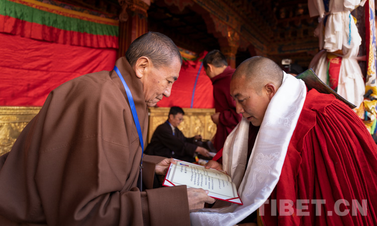 圖為中國佛教協(xié)會(huì)西藏分會(huì)常務(wù)副會(huì)長珠康·土登克珠活佛(左)向考僧頒發(fā)學(xué)位證書 攝影:趙耀