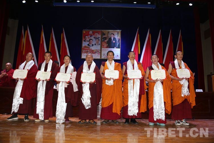 畢業(yè)典禮上,學(xué)院第三屆預(yù)備班111名學(xué)員被授予“聶當(dāng)?禪然巴”初級(jí)學(xué)銜,2017級(jí)學(xué)制班130名學(xué)員被授予“智然巴”中級(jí)學(xué)銜,其中密宗班33名學(xué)員,由中國(guó)佛教協(xié)會(huì)西藏分會(huì)與西藏佛學(xué)院,共同授予“聶當(dāng)?額然巴”學(xué)銜。