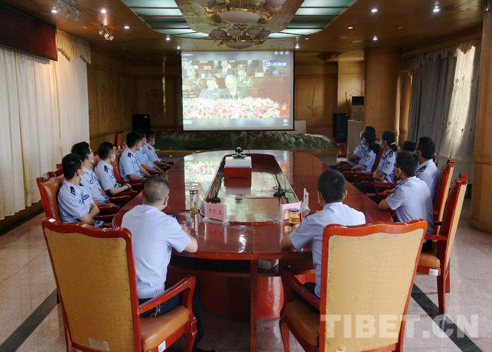 圖為西藏出入境邊防檢查總站執(zhí)法調(diào)查支隊廣大民警收聽收看慶祝西藏和平解放70周年大慶直播盛況