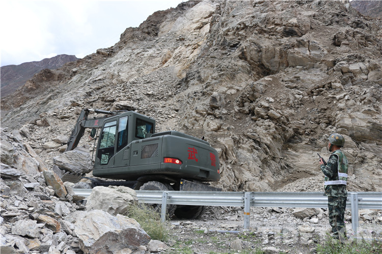 抵達(dá)現(xiàn)場后,武警官兵及時對災(zāi)害路段實施交通管制,并把滯留車輛疏導(dǎo)至安全區(qū)域,隨即對泥石流堆積物和塌方體進(jìn)行清理。因災(zāi)害點處于峽谷地帶,地勢十分險要,作業(yè)面狹窄,且降雨及落石持續(xù)不斷,為確保搶通工作高效安全,指揮員科學(xué)指揮,安全員高度警惕,操作手快速搶通,各要素密切配合,給道路搶通工作爭取了寶貴時間。