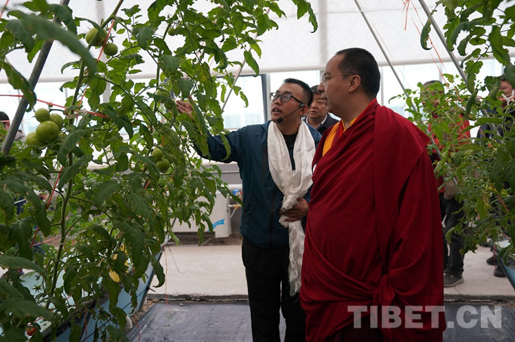圖為班禪仔細(xì)觀察溫室植物的長勢(shì)情況 攝影:王淑