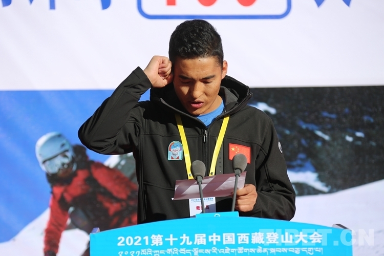 圖為國家體育總局登山運(yùn)動管理中心副主任、中國登山協(xié)會副主席、中國登山隊(duì)隊(duì)長王勇峰為2021第十九屆中國西藏登山大會授旗 攝影:賈華加