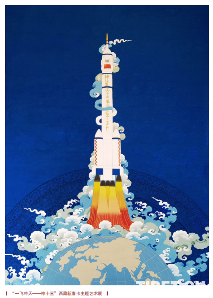 唐卡藝術(shù)家邊巴的新唐卡作品《一飛沖天》,以神舟十三號為主題,描繪了飛船沖出地球奔向星辰大海的瞬間。飛船、地球、祥云的后面,有一個(gè)融入背景的曼荼羅圖案,象征著西藏傳統(tǒng)的宇宙觀。傳統(tǒng)地道的勉唐派唐卡繪畫語言,采自天然礦物富有環(huán)保特征的厚實(shí)顏色,漢藏融合的審美品位,立足中國放眼世界的人類命運(yùn)共同體胸懷,正是新時(shí)代新唐卡新融合的藝術(shù)表達(dá)。