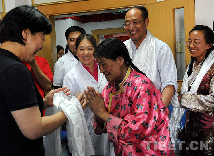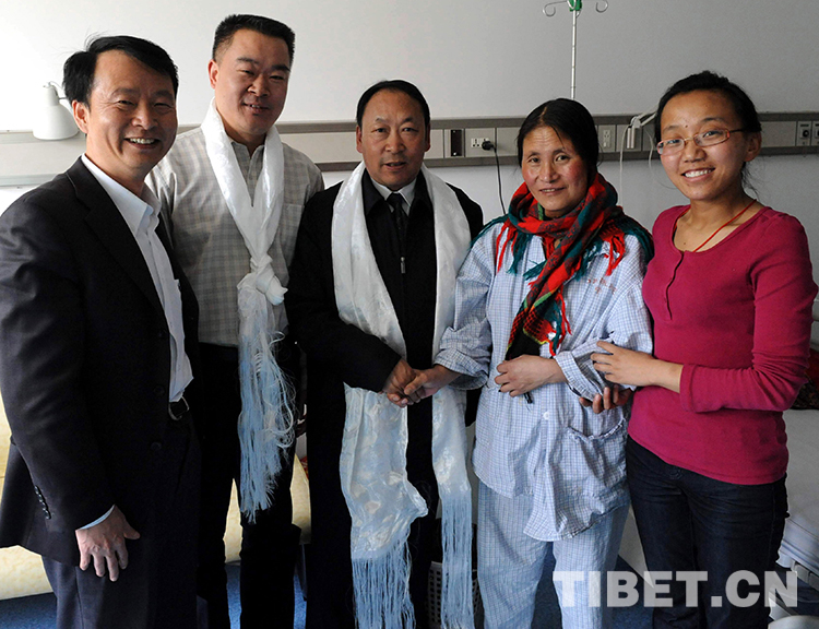 這是術(shù)后的斯求卓瑪在北京藏醫(yī)院向幫助她治病的北京安貞醫(yī)院“海歸”醫(yī)生顧虹(左一)和新華社記者唐召明(右二)等人敬獻哈達,表示感謝(王普2010年5月20日攝)