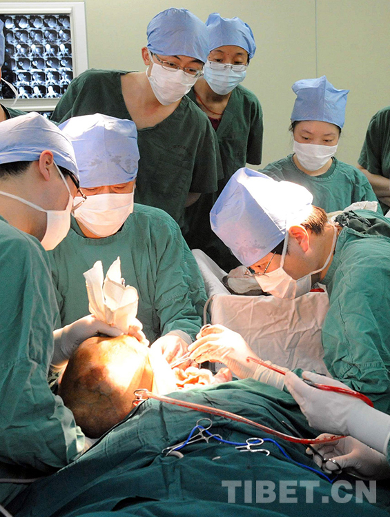 這是北京口腔醫(yī)院口腔頜面外科醫(yī)生在為牧女斯求卓瑪實施手術(shù),將其脖子上一個重達5公斤的巨大腫瘤成功切除(唐召明2010年4月21日攝)