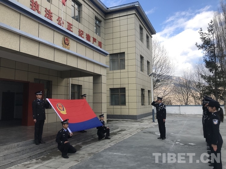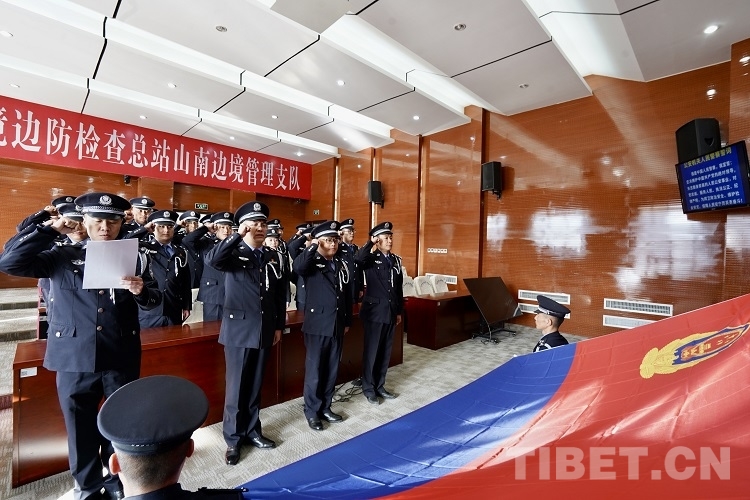 圖為山南邊境管理支隊(duì)機(jī)關(guān)移民管理警察重溫入警誓詞 攝影:索朗次旺