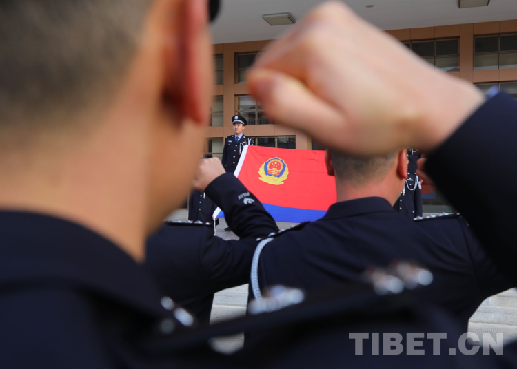 圖為林芝邊境管理支隊(duì)機(jī)關(guān)開展向警旗宣誓活動(dòng) 攝影:姜?jiǎng)P峰