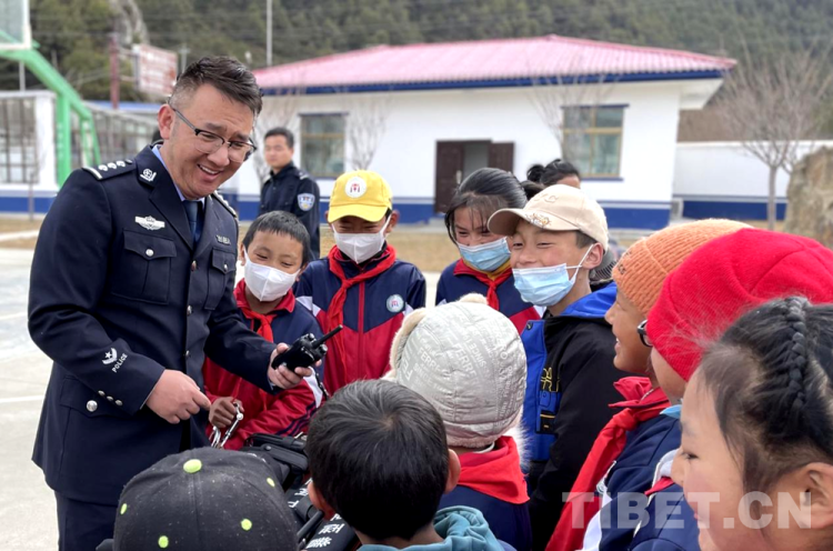圖為林芝南伊邊境派出所邀請(qǐng)駐地小學(xué)生參觀邊境派出所警用裝備 攝影:馬智慧