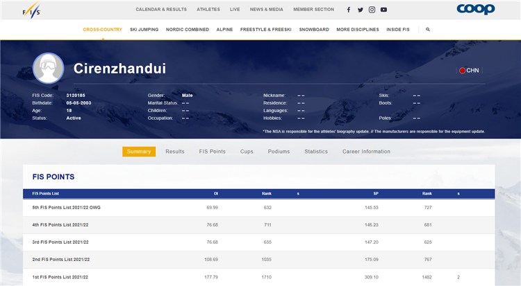 圖為國際雪聯(lián)官網(wǎng)運(yùn)動(dòng)員次仁占堆介紹