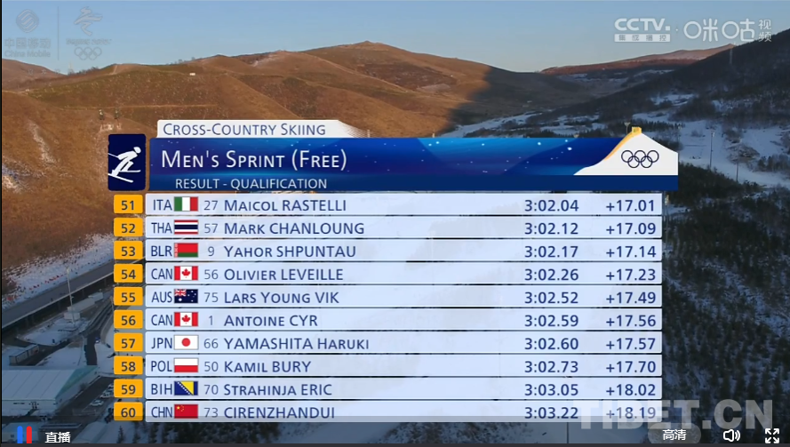 圖為北京冬奧會越野滑雪個(gè)人短距離(自由技術(shù))資格賽成績
