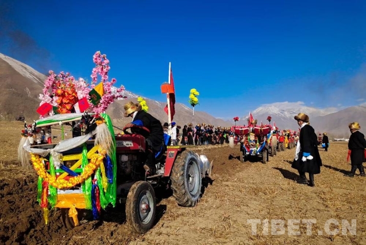 據(jù)悉,儀式當日上午,村民們會身著節(jié)日盛裝,歡聚在田間地頭、載歌載舞隆重舉行春耕春播儀式?;顒蝇F(xiàn)場,姑娘們舉起手中的切瑪、青稞酒、人參果為犁手們唱歌敬酒,在祝福的歌聲中,開啟春耕“第一犁”。在西藏,過去是牦牛耕地,如今,隨著農(nóng)業(yè)科學化發(fā)展,現(xiàn)在農(nóng)耕都用現(xiàn)代化的拖拉機“鐵?!备?。一般吉時一到,一個個犁手頭頂金黃圓筒帽,身穿氆氌藏裝駕著一輛輛插著五星紅旗,系著潔白哈達的“鐵?!本従忨傔M田間,一片片沃土隨著鐵犁慢慢翻開,婦女們在后面播撒青稞良種……在田埂上形成一道最靚麗的風景線,好不壯觀!