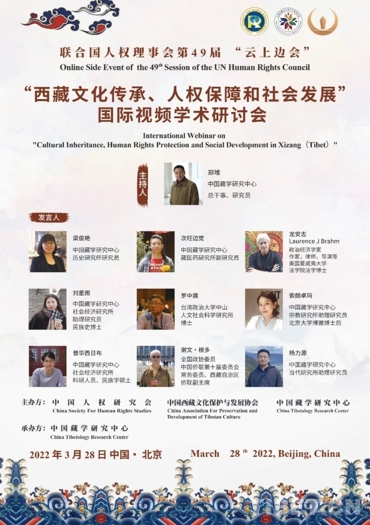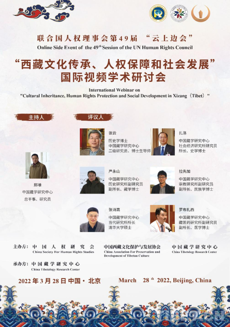 中國(guó)西藏網(wǎng)訊 3月28日,聯(lián)合國(guó)人權(quán)理事會(huì)第49屆“云上邊會(huì)”“西藏文化傳承、人權(quán)保障和社會(huì)發(fā)展”國(guó)際視頻學(xué)術(shù)研討會(huì)在北京舉行,國(guó)內(nèi)外有關(guān)專家學(xué)者40余人以線上線下相結(jié)合的方式參加了研討。