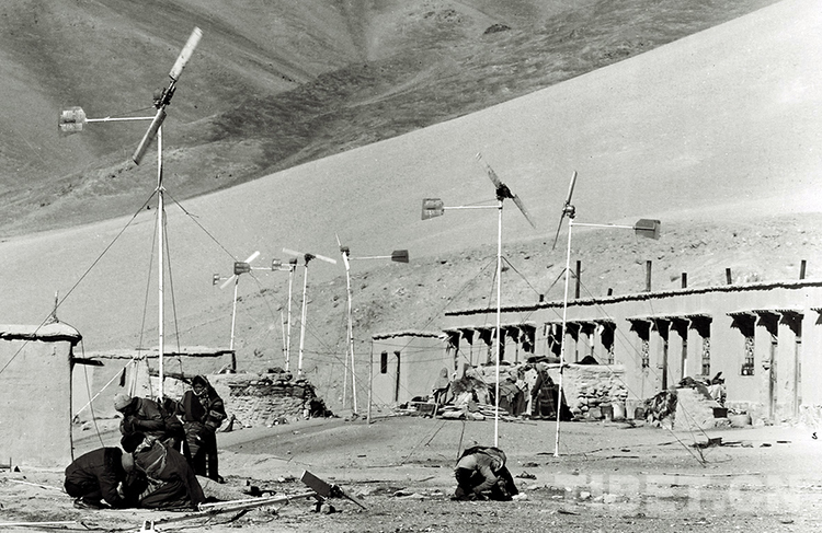 這是那曲地區(qū)(現(xiàn)那曲市)風能實驗站的技術(shù)工人在幫助嘎措鄉(xiāng)一村村民維修保養(yǎng)風力發(fā)電機(唐召明1988年攝)