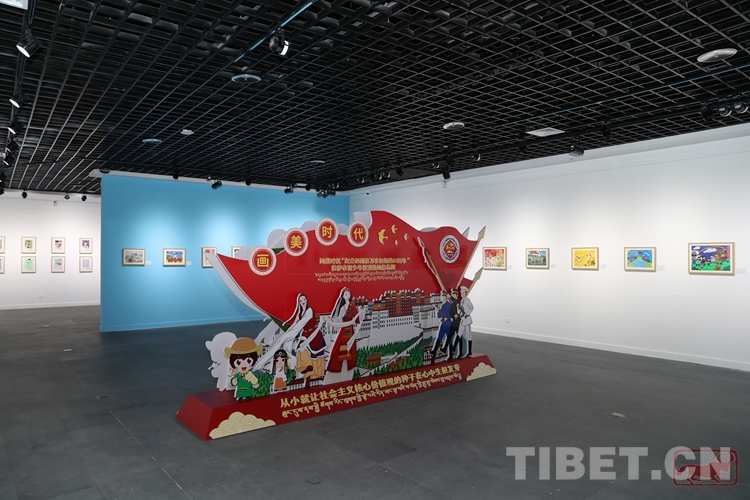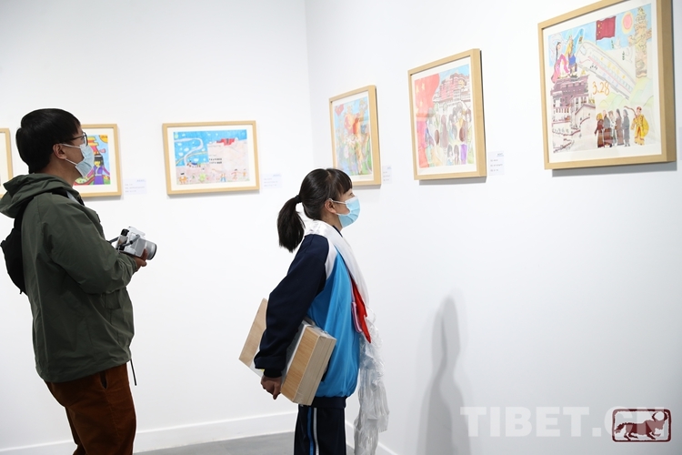 圖為畫美時(shí)代——“紀(jì)念西藏百萬農(nóng)奴解放63周年”拉薩市青少年優(yōu)秀繪畫作品展現(xiàn)場