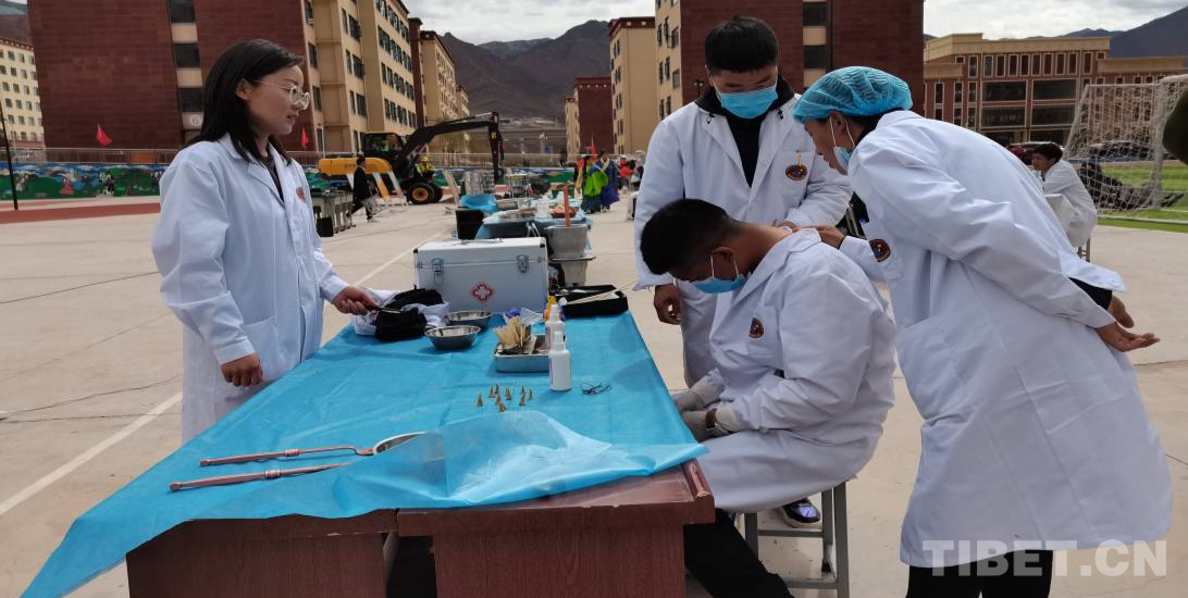 藏醫(yī)藏藥專業(yè)的同學(xué)們在老師的指導(dǎo)下,有條不紊地進(jìn)行著火灸,三兩個(gè)同學(xué)一起配合,在“患者”頸部選定穴位,點(diǎn)火,看火,直至火焰熄滅,一次火灸時(shí)間為10至15分鐘。在火灸演示后方,同學(xué)們正展示著藏藥足療,濃郁的藥草味、熟練的手法盡顯藏醫(yī)養(yǎng)生療法特色。