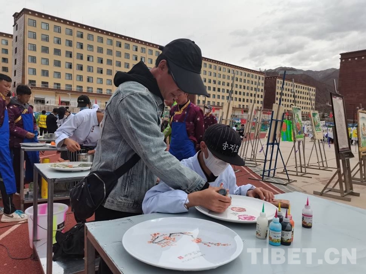 圖為烹飪專業(yè)教師李建國指導(dǎo)來自丁青縣的洛松德青制作果醬畫