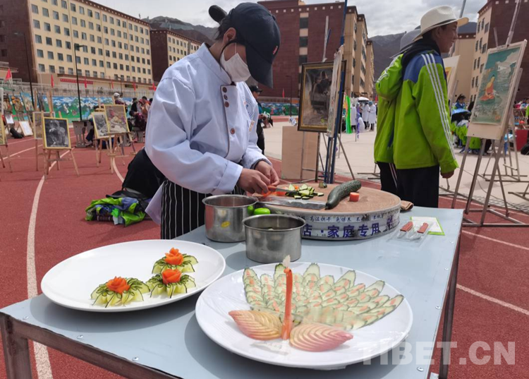 圖為來自察雅縣的加永卓瑪同學(xué)展示自己冷拼作品“孔雀開屏”