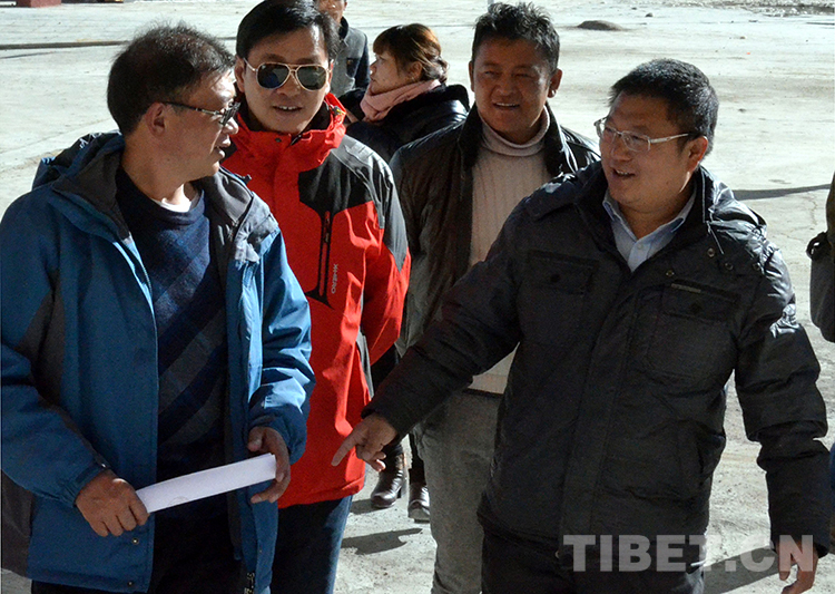 這是中國(guó)石化援藏干部王鵬雁(右一)在中國(guó)石化小學(xué)二期工程驗(yàn)收現(xiàn)場(chǎng)同其他縣領(lǐng)導(dǎo)進(jìn)行交流(扎西2014年10月25日攝)